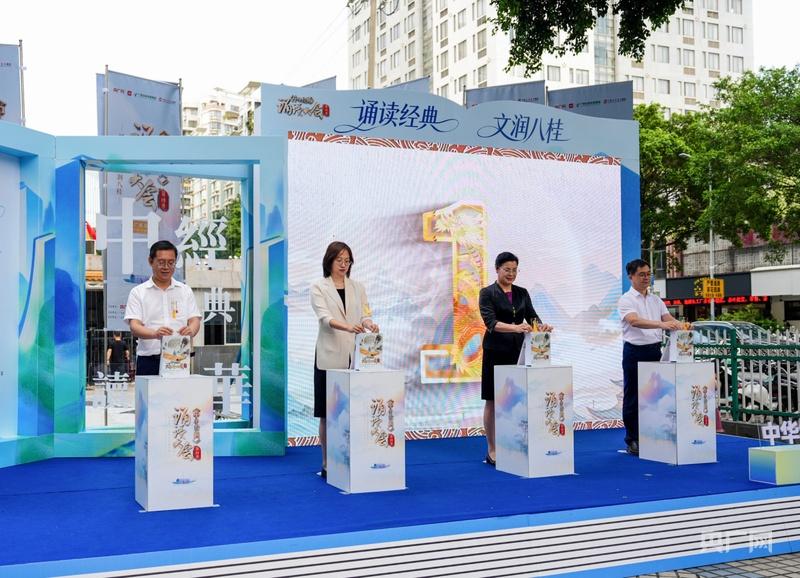 在启动仪式环节,领导嘉宾共同手持特制书签,将其嵌入象征“书”的启动装置中。随着倒计时结束,大屏幕点亮“诵读经典·文润八桂”主题画面,标志着“中华经典诵读大会”(第四季)广西站正式启航。