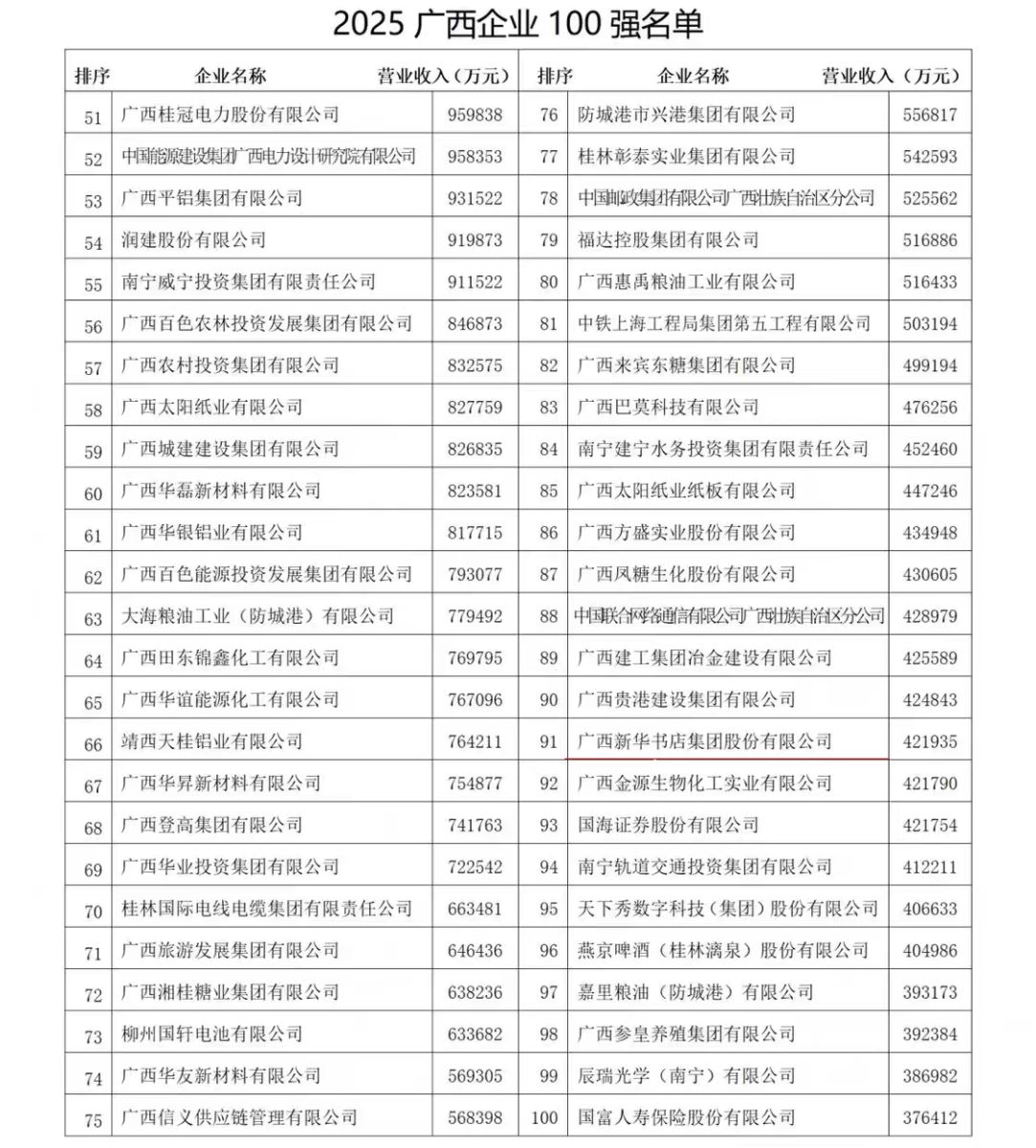 2025年9月29日,广西企业与企业家联合会发布《关于公布2025广西企业100强、制造业企业100强、服务业企业100强的通知》,广西新华书店集团股份有限公司获“2025广西企业100强”和“2025广西服务业企业100强”荣誉。